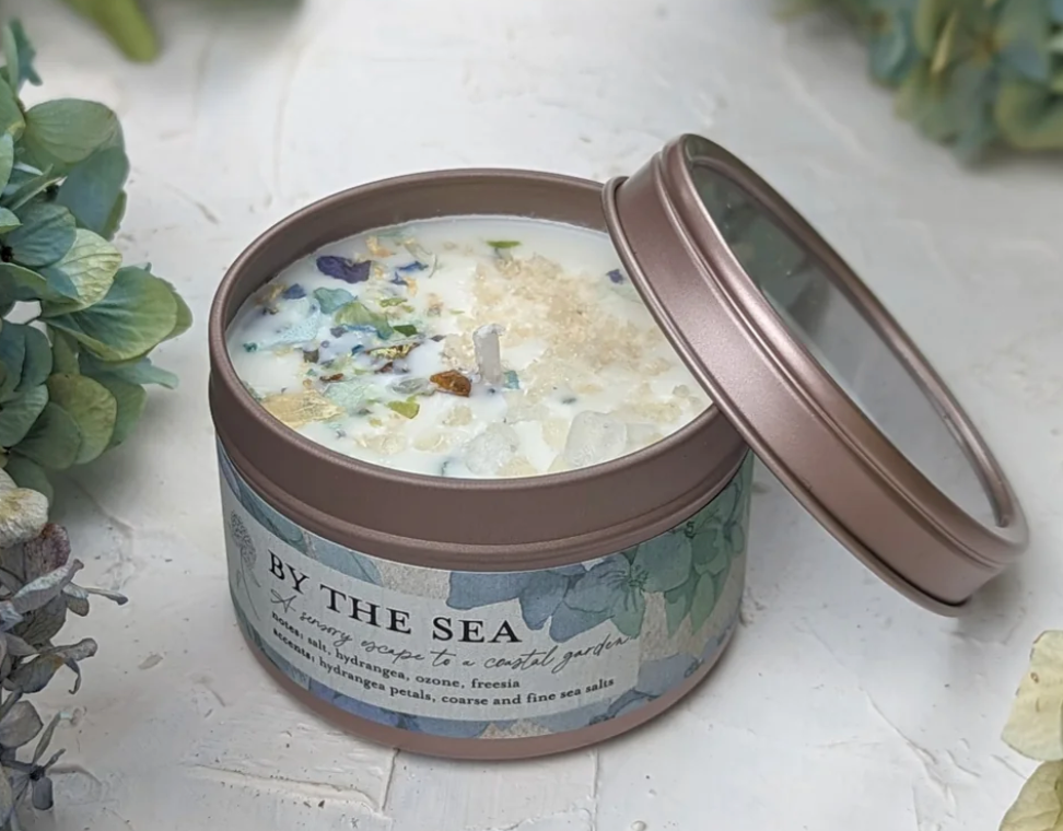 Topped with dried blue hydrangea petals and a mix of sea salts, this dreamy candle features natural fragrance notes of salt, hydrangea, ozone, and freesia.