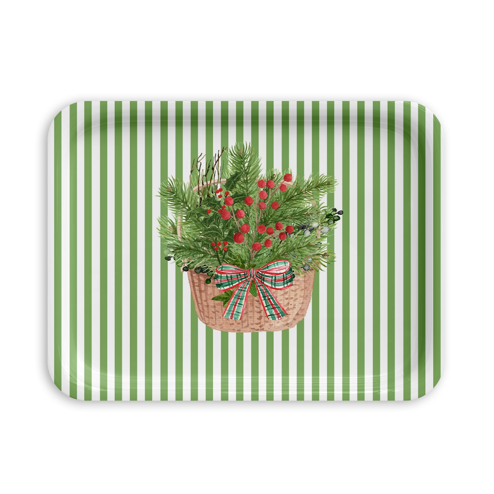 Celebrate the warmth of the season with this festive tray, featuring a hand-painted woven basket filled with pine boughs, red berries, and holiday greenery, finished with a plaid ribbon