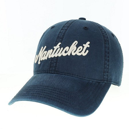 Slightly distressed navy hat with white letters, this Nantucket script hat is a classic for years to come